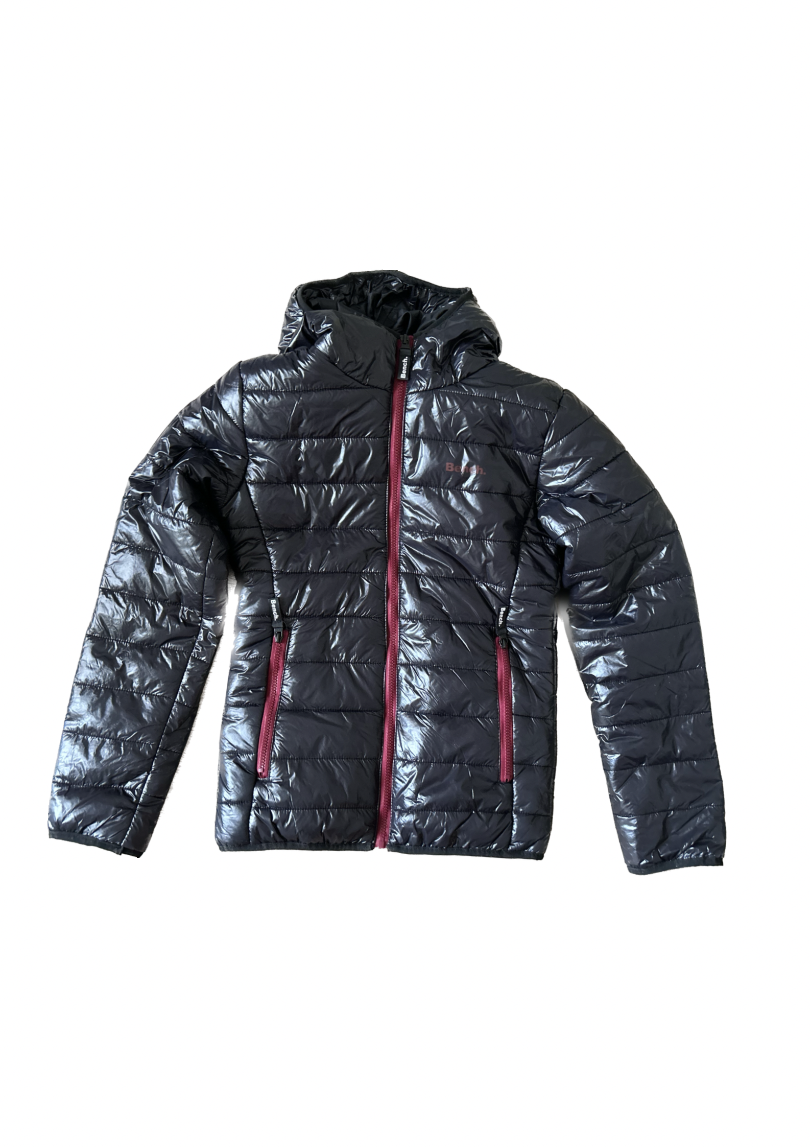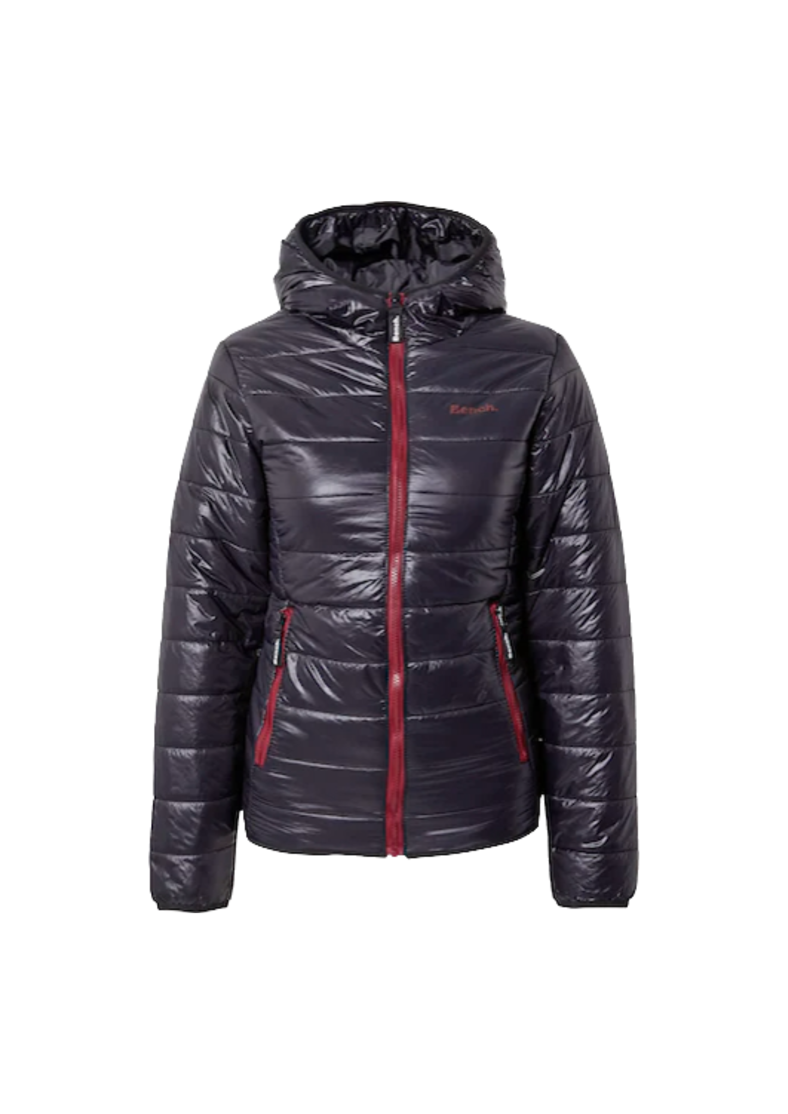 Przejściowa kurtka damska z kapturem marki Bench. Czarna z bordowymi elementami przy zamkach błyskawicznych.